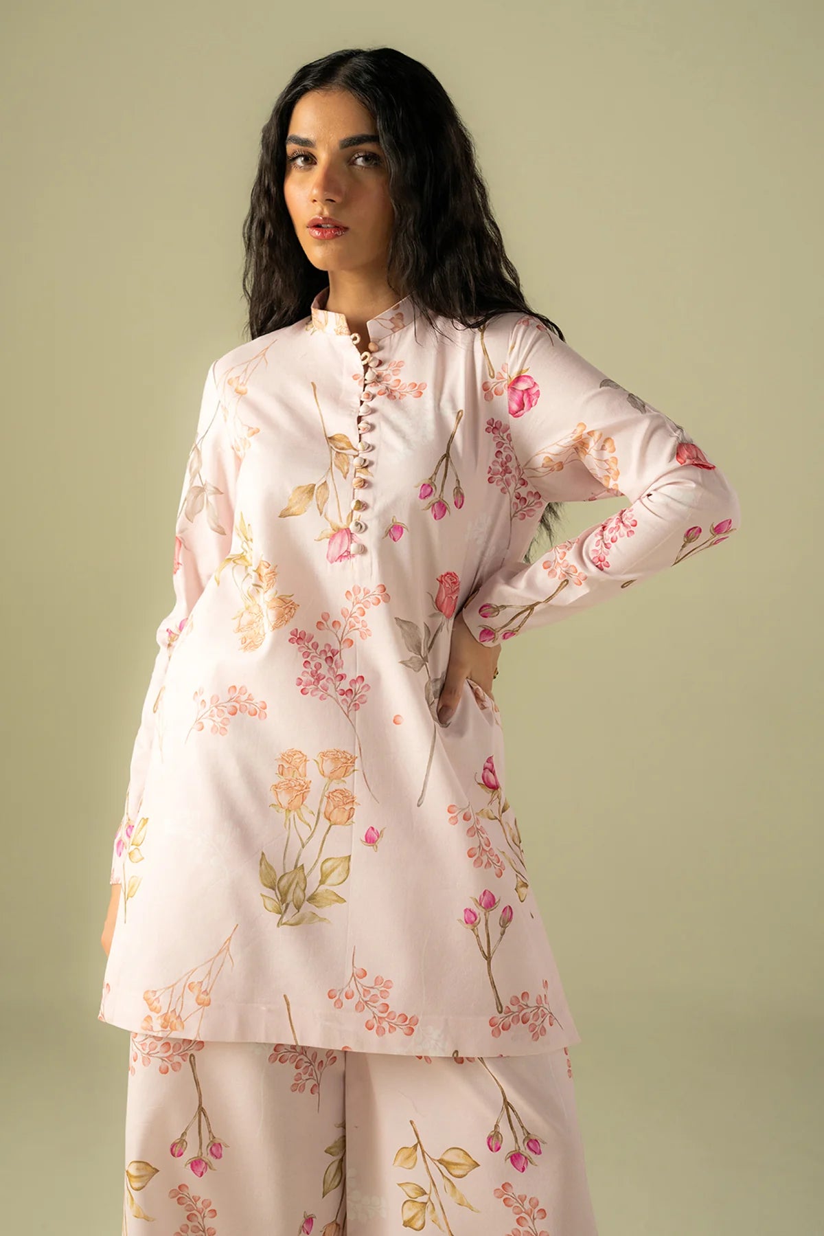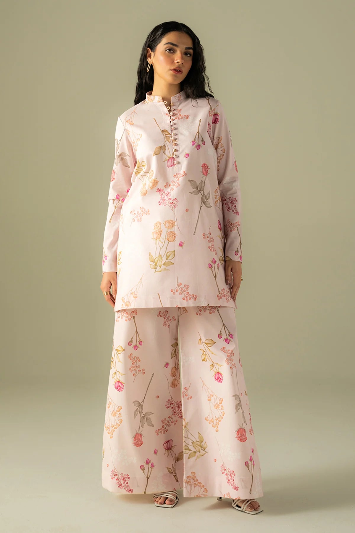 A blush pink co-ord set adorned with soft floral prints, blending elegance with ease.