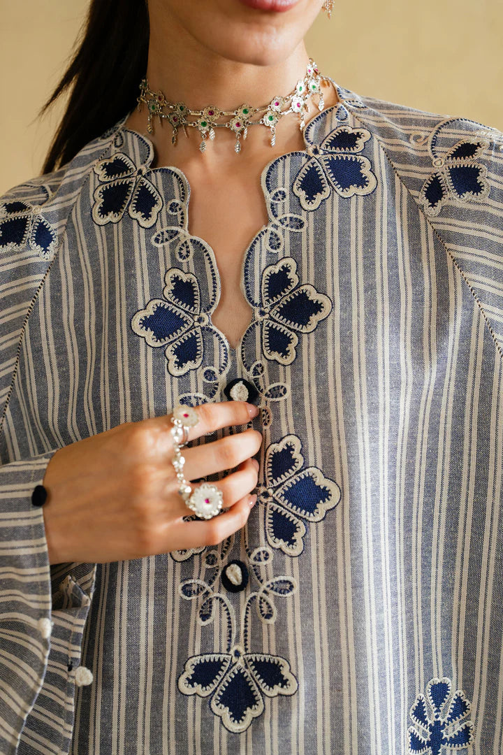 Bathed in the soft glow of grey-blue yarn-dyed Irish linen, Mira drifts like an autumn breeze. Navy botanical motifs bloom gently across the short round-hem shirt, while a scalloped neckline, intricately embroidered with delicate florals, whispers of quiet mornings and golden light. Matching trousers, adorned with embroidered botanical accents along the borders, complete this ensemble—an ethereal dance of falling leaves and stitched threads, where elegance meets the poetry of the season.