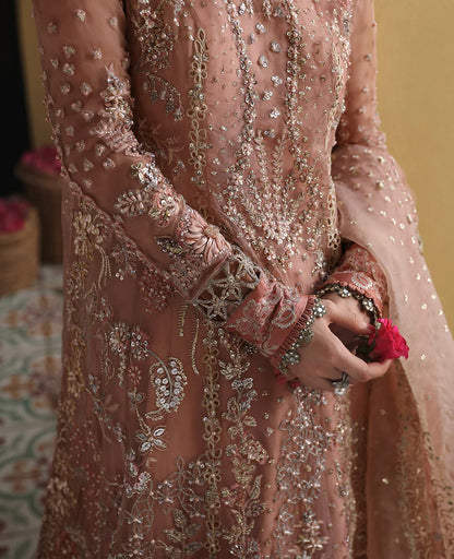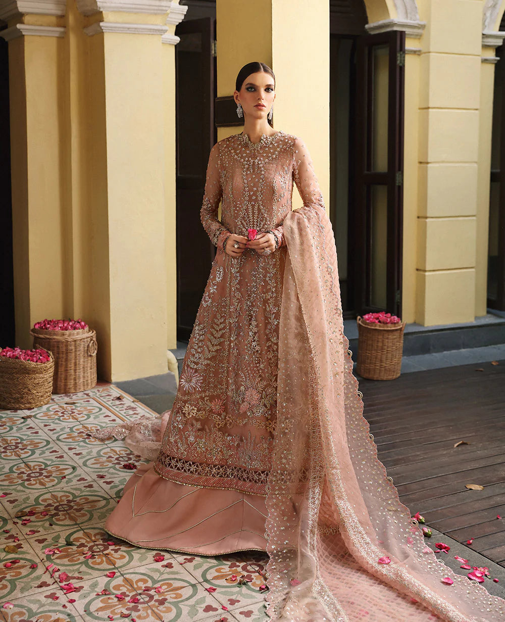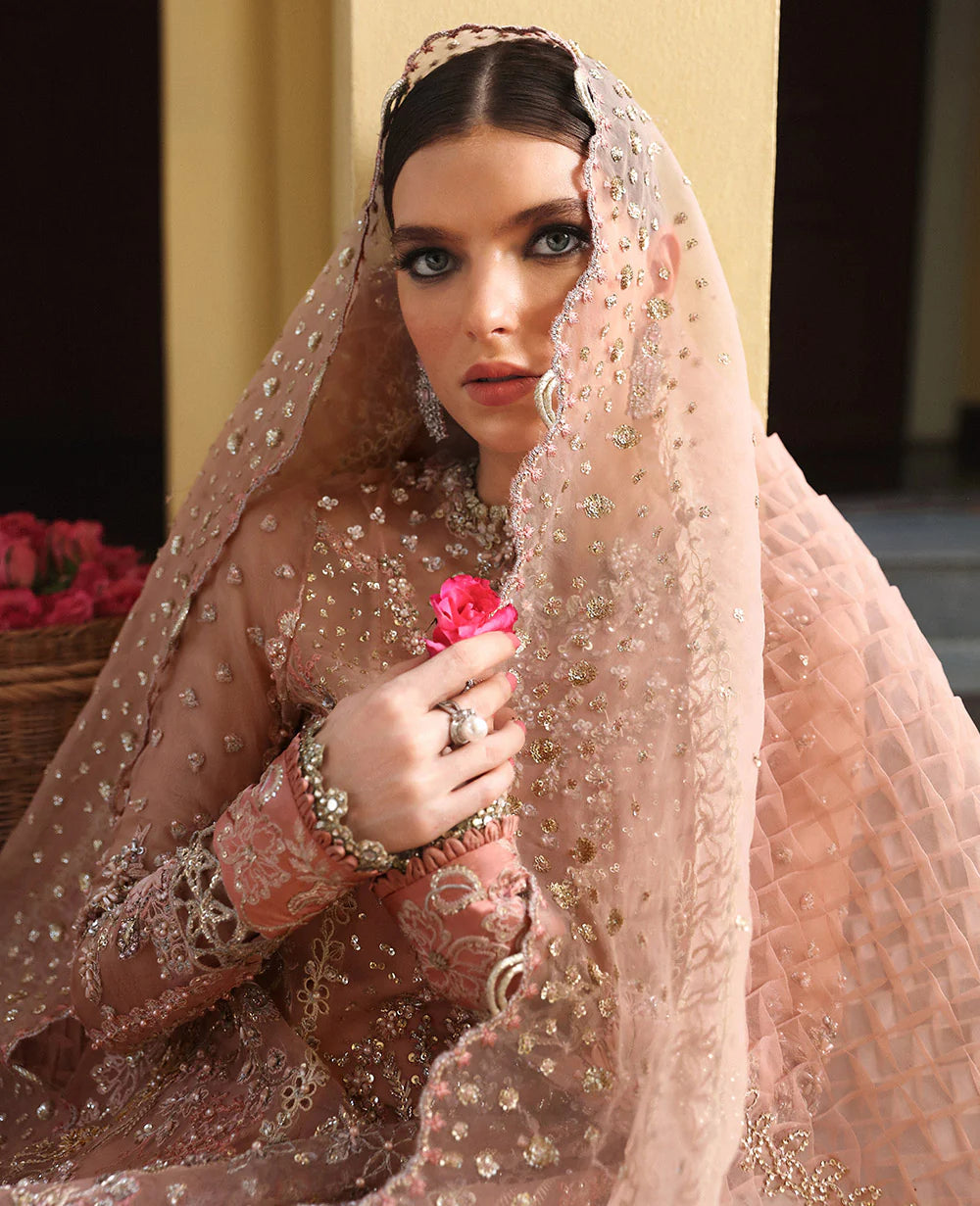 Baia emerges as a vision in peach, adorned with a hand-work pleated dupatta bordered by a frosted scalloped edge. The classic floor-length lehenga is accentuated by lace details and zig-zag chapti pati, harmonizing with the embroidered organza shirt. A crew neckline, with modern cutwork and embellishment, flows into a waist-long embroidery, exemplifying elegant artisanship.