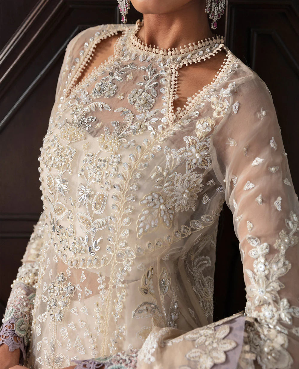 Enshrouded in purity, Elodie is a serene dress with white three-panel organza shirt embraces a contemporary crew neckline that graces the collarbones, edged with delicate lace. Schiffli embellishments cascade along the hem, where lilac lace gently extends the design's elegance. Complementing the ensemble, the aux silk sharara features charming chalta pallu accents. The organza dupatta, crowned with a grand scalloped border in lilac, echoes the embroidery's flow, while accent-colored lace adorns the filled sleeves and sharara, creating a cohesive feast for the eyes.