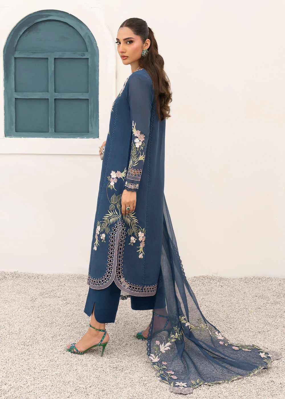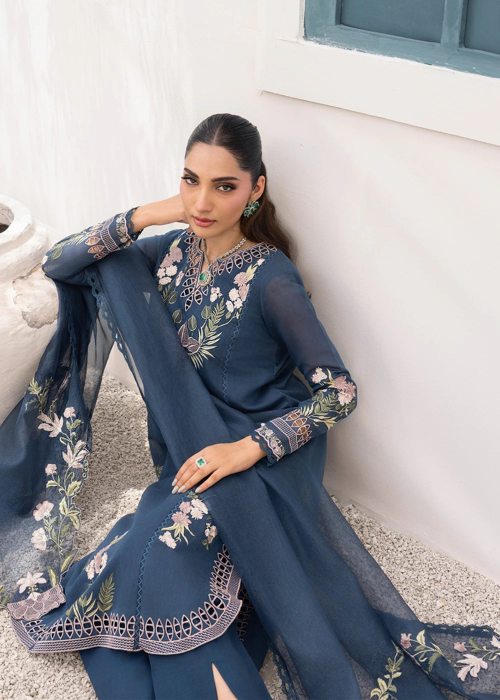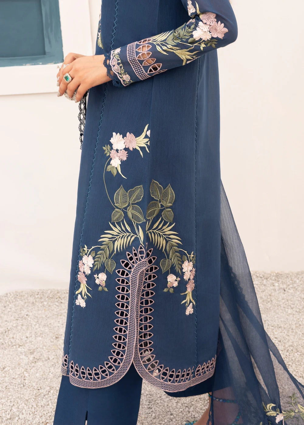 A Whisper of Midnight. A homage to midnight summer blooms. Set against an ink blue canvas on Khaadi cotton delicate florals in fine ghara embroidery and cutwork accents. Paired a cotton net dupatta edged in floral cut out vines, this ensemble speaks softly, yet powerfully. Crafted for the woman who leads with quiet grace and effortless beauty. Shirt Length 48 Pants Length 37 Fabric Details: Shirt: Khaadi Cotton Pants: Cotton Silk Dupatta: Cotton Net Slip: Cotton Silk