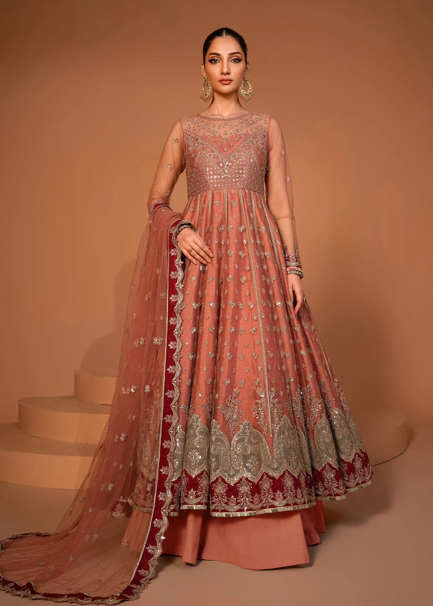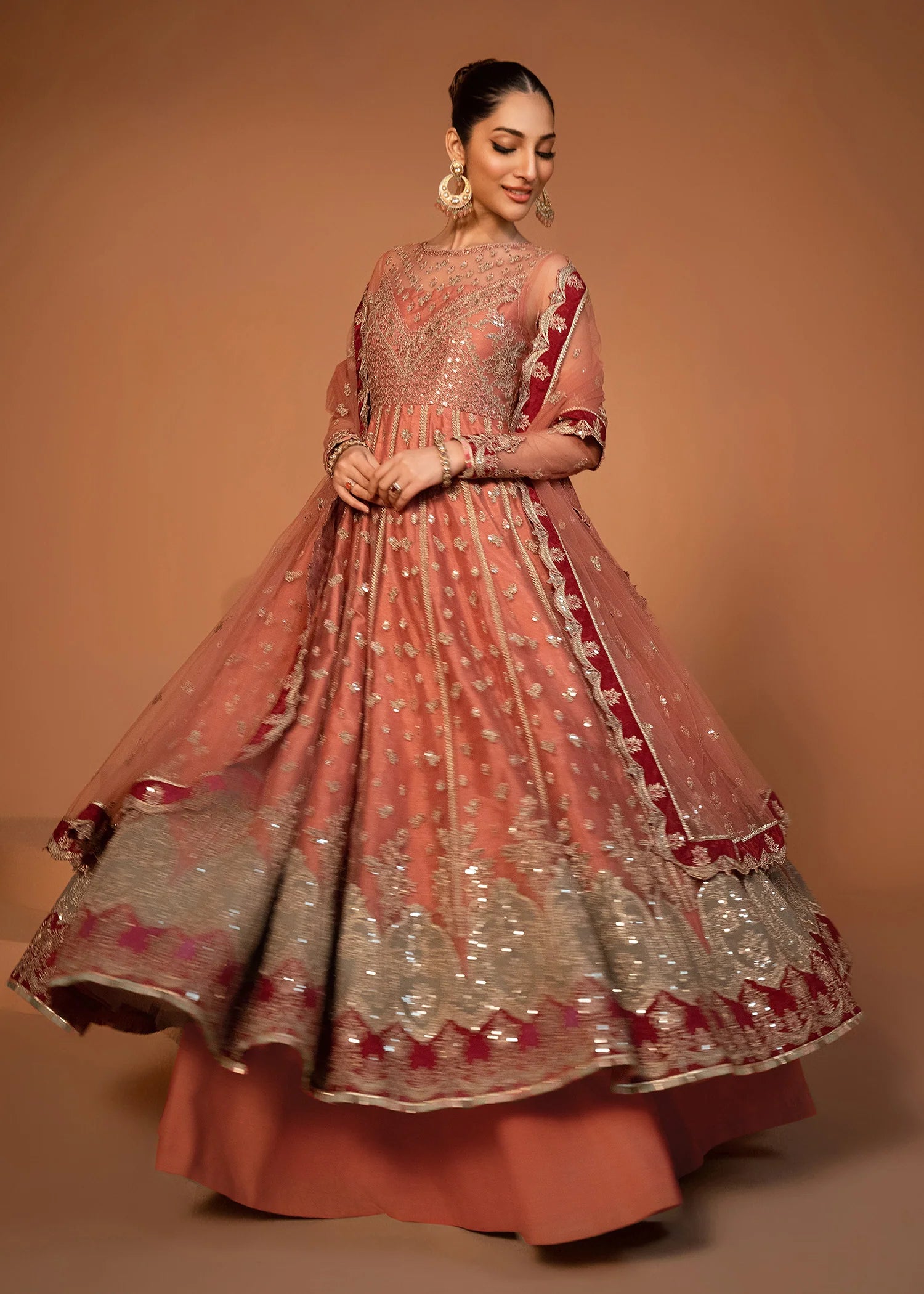 This masterpiece features intricate embroidery spread across the entire pishwas, reflecting refined craftsmanship. The embroidered net dupatta, embellished with a delicate all-over spray, adds a layer of grace and sophistication. Complementing the pishwas is a luxurious silk lehenga that enhances the ensemble’s grandeur. Designed for weddings and festive occasions, this outfit combines elegance and tradition, ensuring you stand out effortlessly with every step.